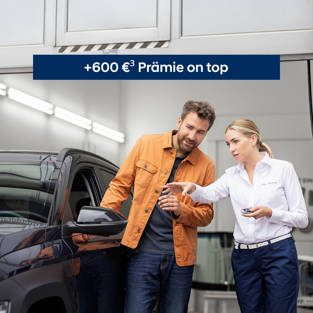 ³ Die Hyundai Prämie in Höhe von 600,00 Euro gilt für Privat- und Gewerbekunden bei Kaufvertragsabschluss und Zulassung eines noch nicht zugelassenen Neufahrzeuges (Tucson Verbrenner, Hybrid oder Plug-in-Hybrid, Kona Verbrenner oder Hybrid und i20) bis 30.12.2025. ohne Inzahlunggabe eines Fahrzeuges. Ausgenommen sind Autohäuser und Autovermieter, Taxiunternehmen und Mobilitätsanbieter. Nicht kombinierbar mit weiteren Sonderaktionen oder Sonderkonditionen. Nur bei teilnehmenden Hyundai Partnern. Prämienangaben inkl. gesetzlicher MwSt.